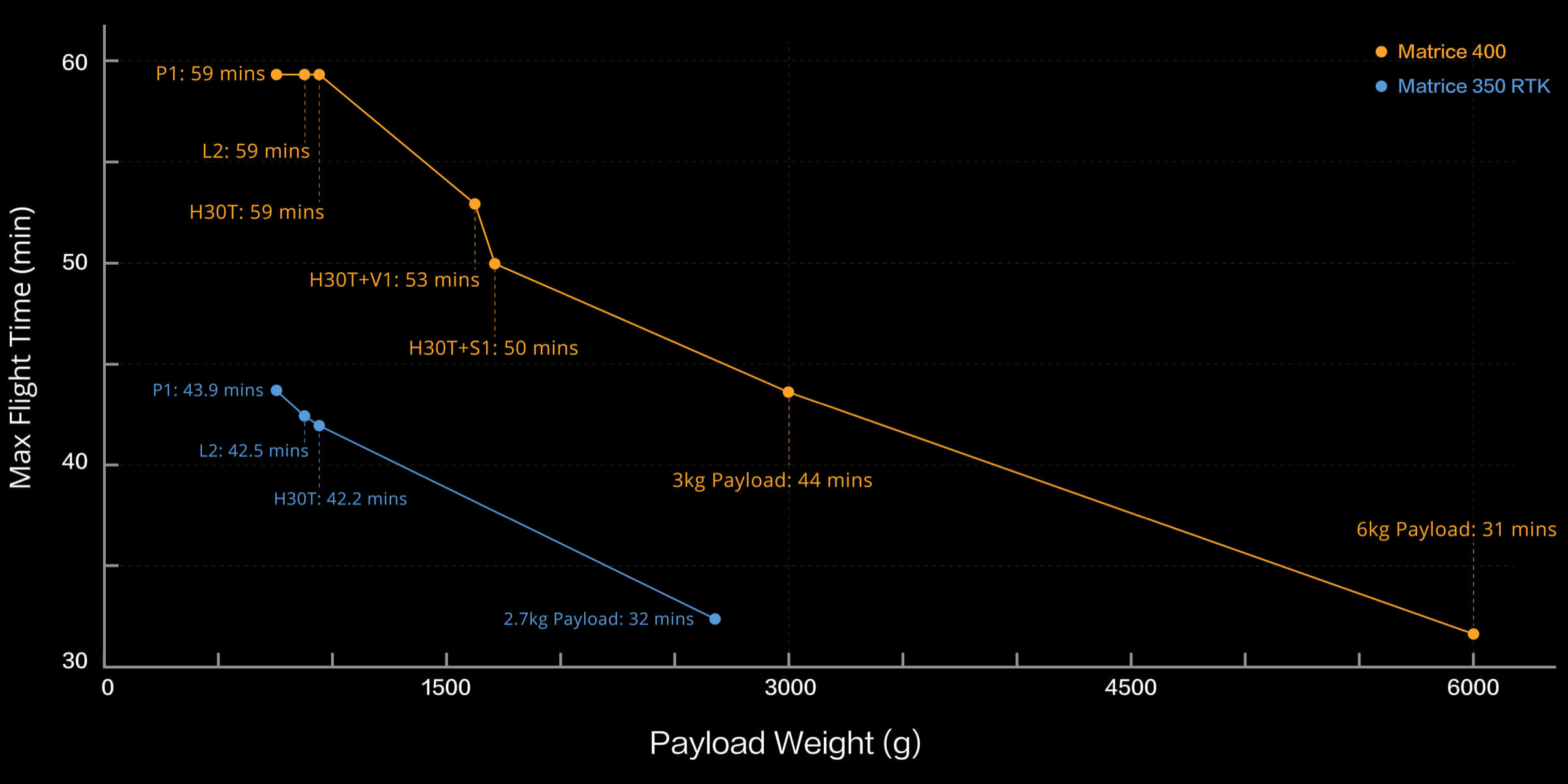 Estime o tempo de voo do Matrice 400 com base na configuração de cargas.